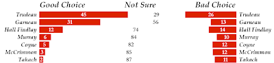 Hall Findlay's good choice score doubled to 12%, while 14% (-2) thought she would be a bad choice. Nevertheless, 74% of Canadians were still unsure. For Joyce Murray, Deborah Coyne, Karen McCrimmon, and George Takach, too many people were not sure of who they are or what they think of them to make their numbers very meaningful. It does seem, though, that about 1-in-10 respondents thought that their lack of renown made them a bad choice for leader.