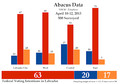 A poll was released earlier this week by Abacus Data, done for VOCM (a radio station in the province). The results confirmed both what Forum Research's IVR poll (Abacus did one with live-callers) and what the regional swing would have us believe to be a likely outcome.