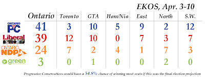 Would the Greens actually win three seats if an election were held today? Almost certainly not - EKOS only gives the Greens 5.7% support among "likely voters", and at that level their seat count would drop to zero. But it is interesting to see that the Greens aren't too far away from potentially being competitive in a handful of ridings. If the provincial Greens make a splash in British Columbia's election on May 14, I would not be surprised if Green parties throughout Canada gain a little lustre.