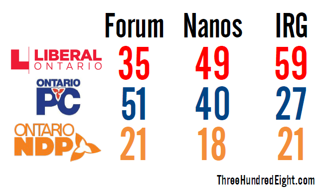 The seat implications for these sort of ranges are enormous. The three most recent polls point to anything from a PC minority government to a Liberal majority.